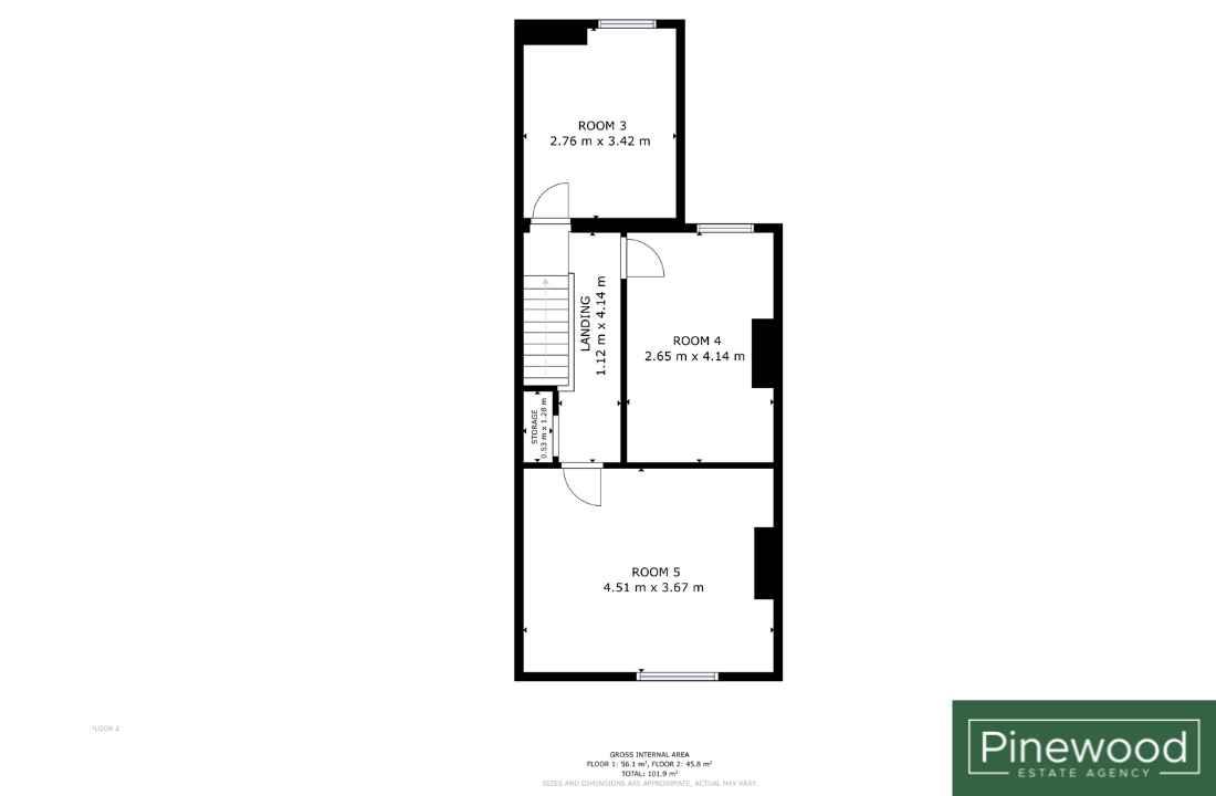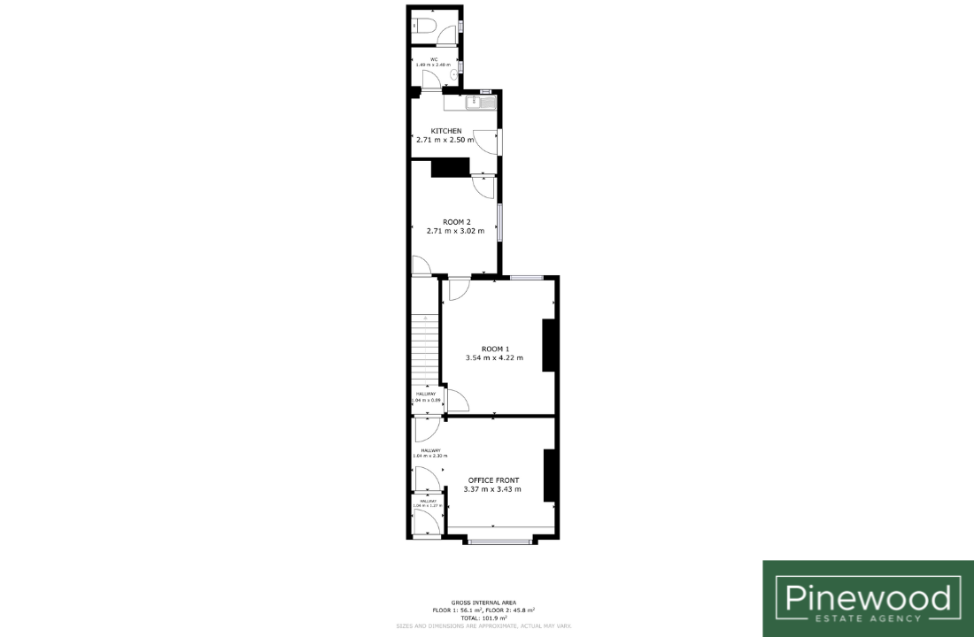 The unit is 101.9 square metres (1096.84 ft). Arranged over two floors, the ground floor features an inviting shop front, two flexible rooms, a kitchen, and a WC. Upstairs, a landing provides access to three additional rooms and a convenient storage cupboard, offering plenty of space for a variety of business needs.