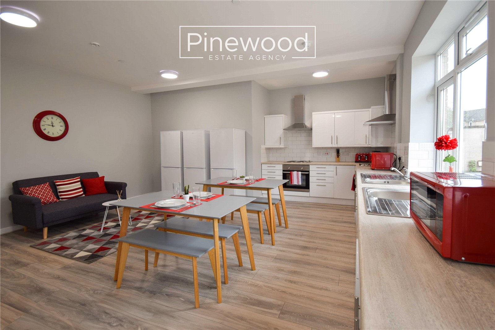 A large communal room consists of a sitting area and dining furniture. White, high-gloss units provide an abundance of cupboard space. The kitchen area has 2 electric ovens; 2 electric hobs with extractor fans; 2 microwaves; 2 kettles; 2 toasters; 2 washer/dryers; and 3 fridge/freezers.