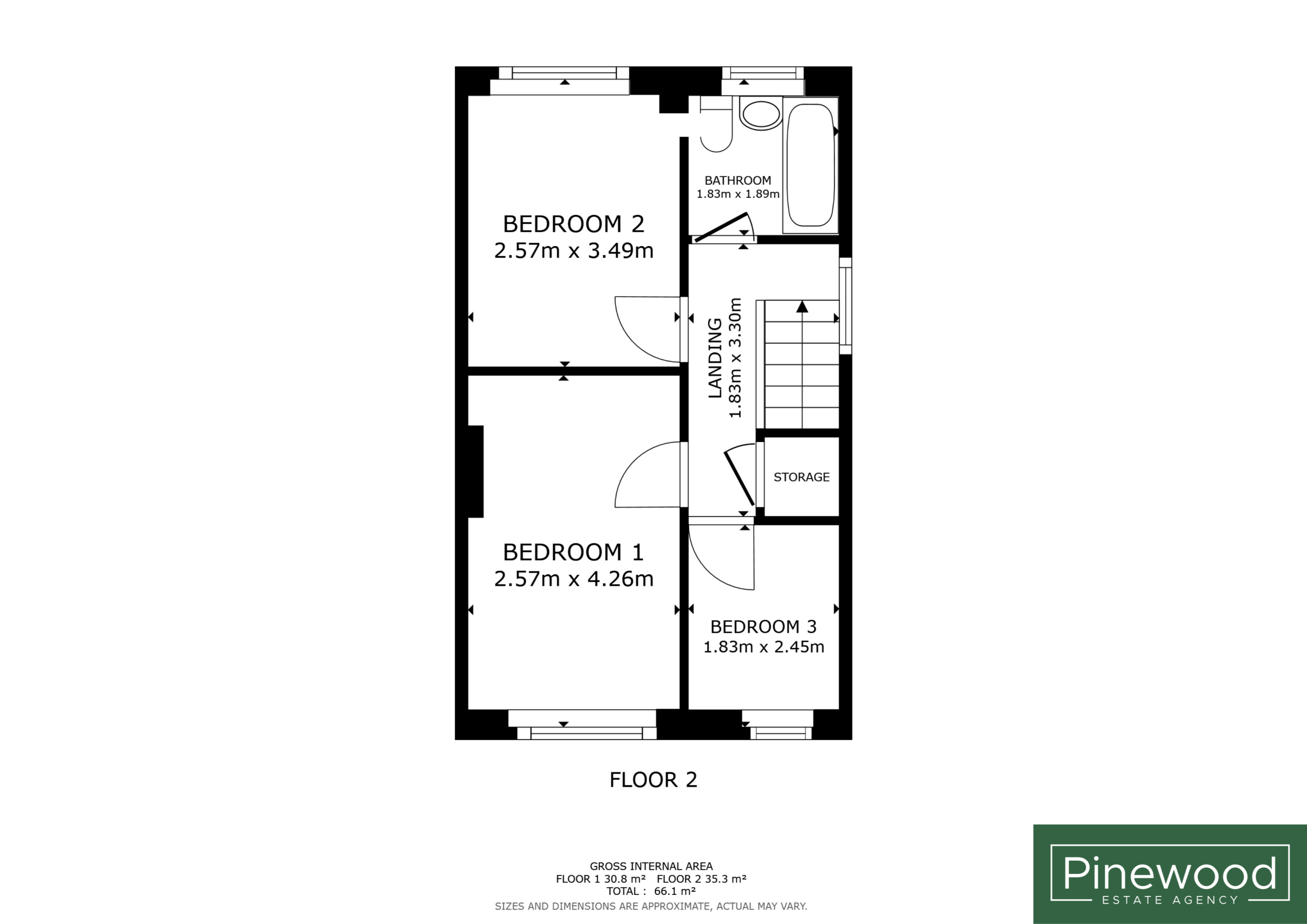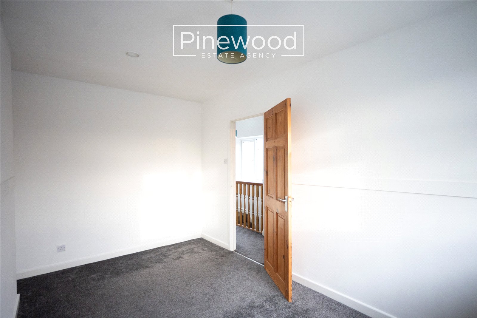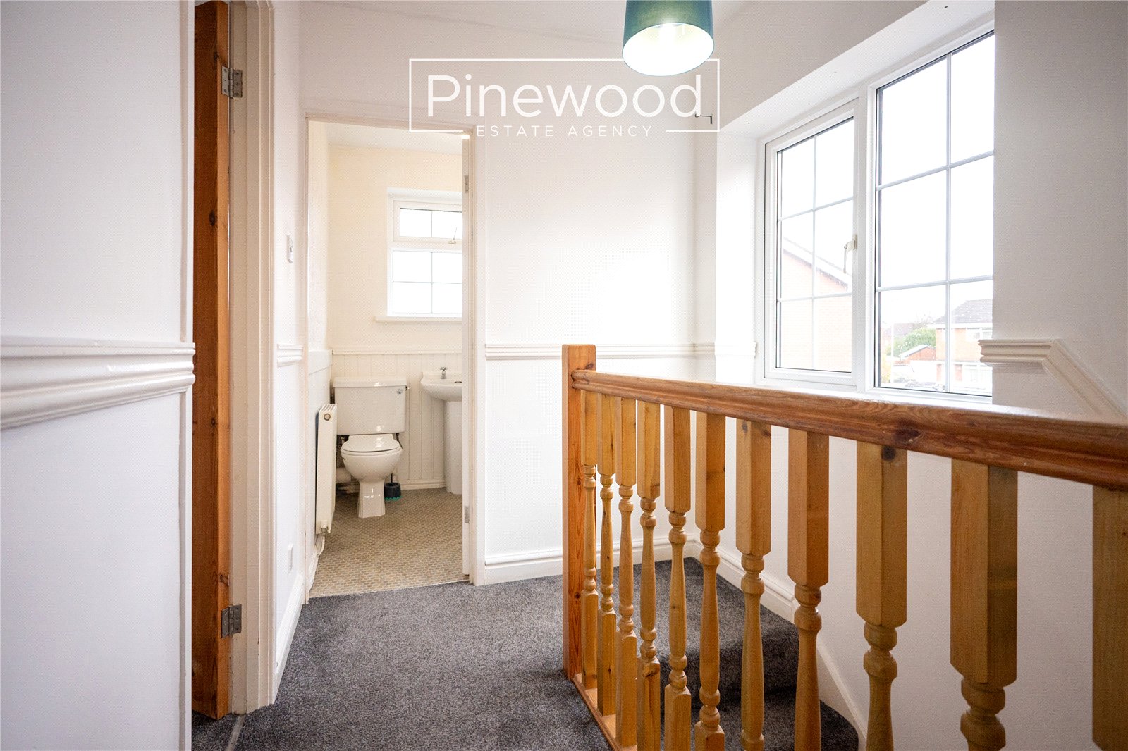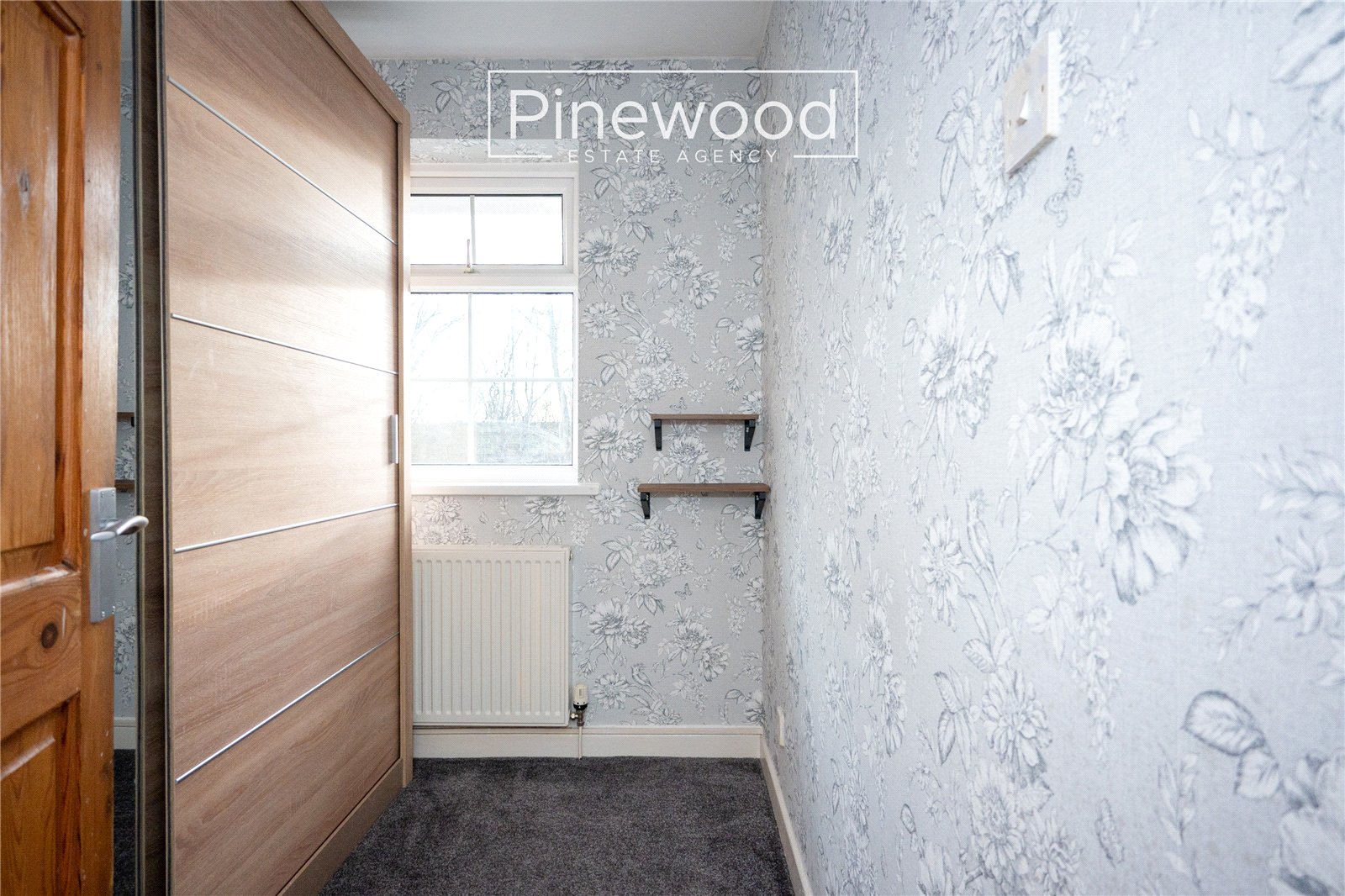 At the top of the stairs, a striking window floods the landing with natural light. The first floor comprises three bedrooms and a family bathroom, all offering scope for modernisation. The family bathroom includes a WC, hand basin, and a bath with shower attachment. The main bedroom, located at the front of the property, benefits from a large window and modern grey carpeting. The second double bedroom is positioned at the rear and features a large window. The third bedroom currently houses a built-in wardrobe, which can be removed to create a single bedroom or home office.