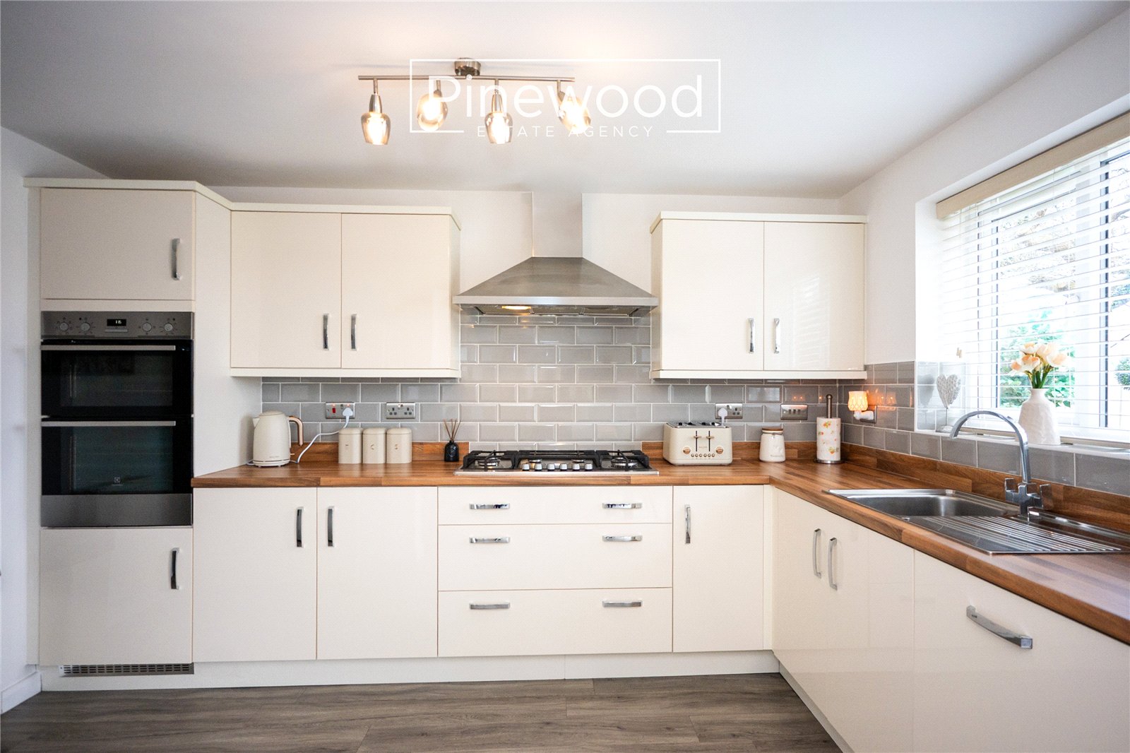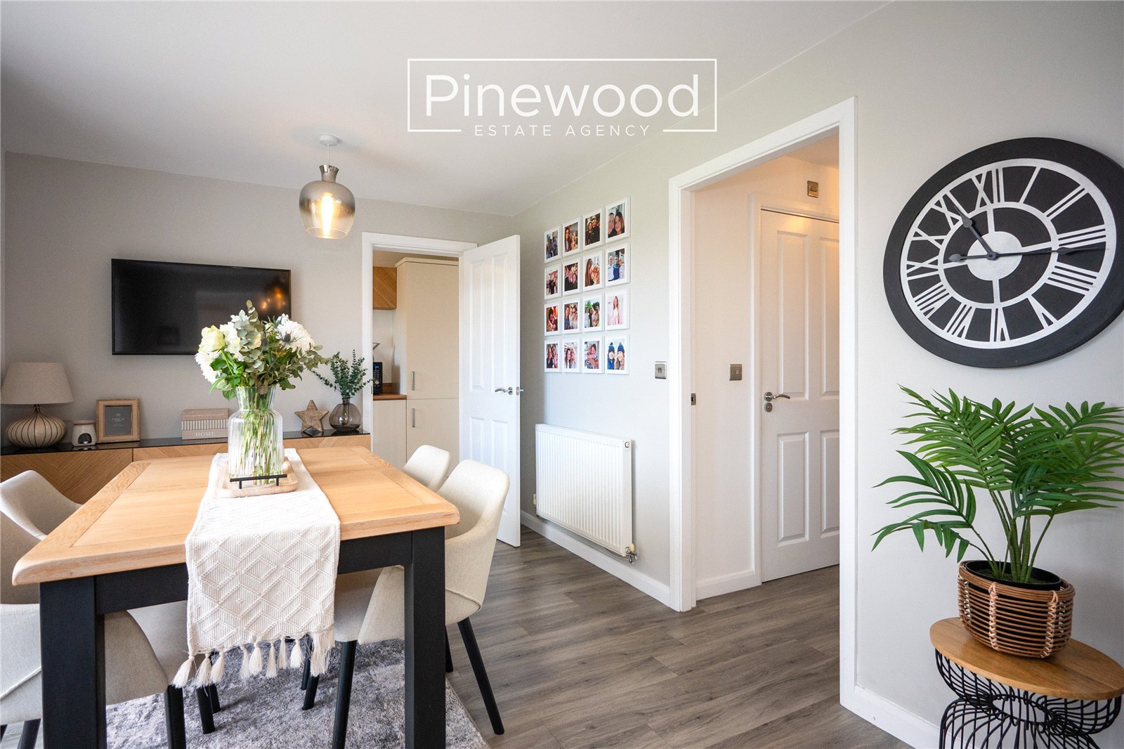 Enter the family home into the welcoming hallway enhanced by elegant wall panelling finished in a tasteful neutral palette, setting the tone for the high-quality décor throughout the home. The ground floor of the property comprises; spacious lounge featuring a large bay window, flooding the space with natural light. To the rear of the property lies the heart of the home — a stunning open-plan kitchen and dining space, thoughtfully designed for both everyday living and entertaining. The modern kitchen is a generous size, integrated appliances include a gas hob with an extractor fan above, double oven and dishwasher all situated between the cream under counter and wall units with space for further white goods. The dining area is the perfect place for family dining and entertaining with ample space for your dining table and views of the fields behind from the French doors opening into the garden. The handy utility room provides further storage and plumbing for your washing machine. With access to the garden – ideal for pet owners! An external door provides access to the garage. Completing the ground floor is the WC, this suite consists of WC and hand basin.