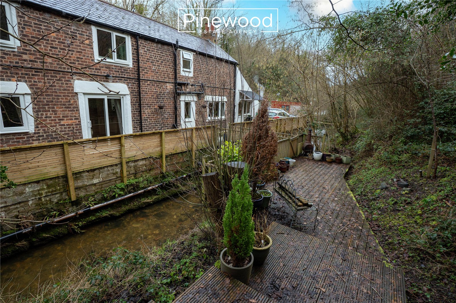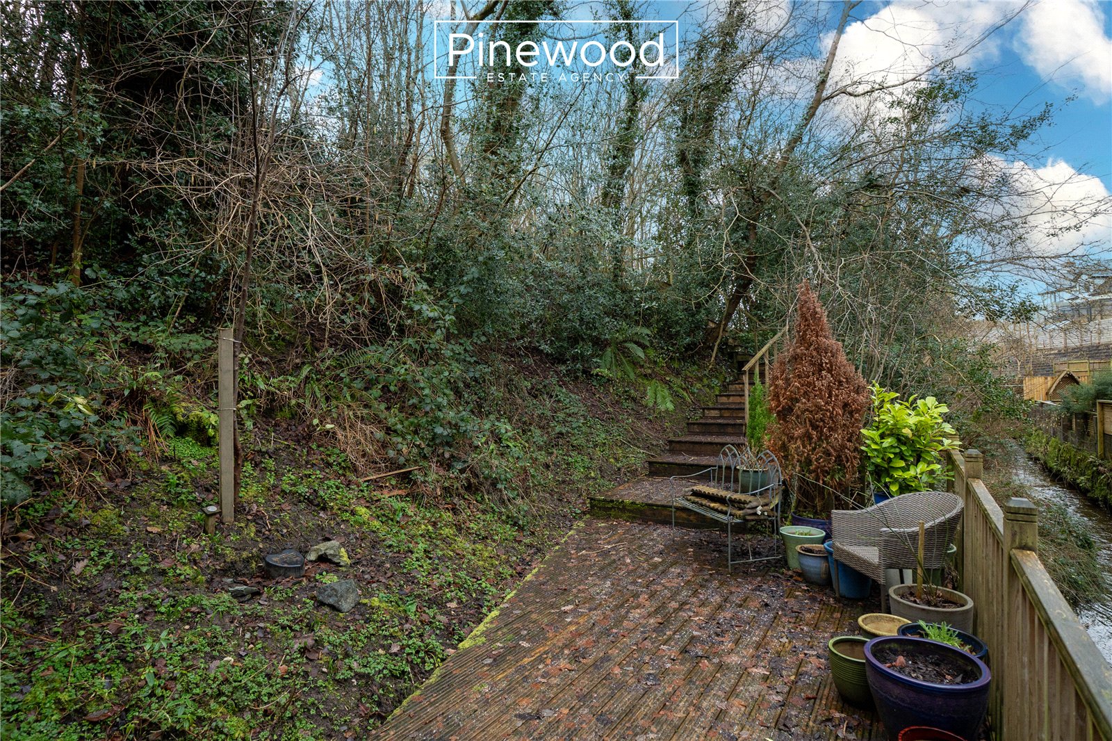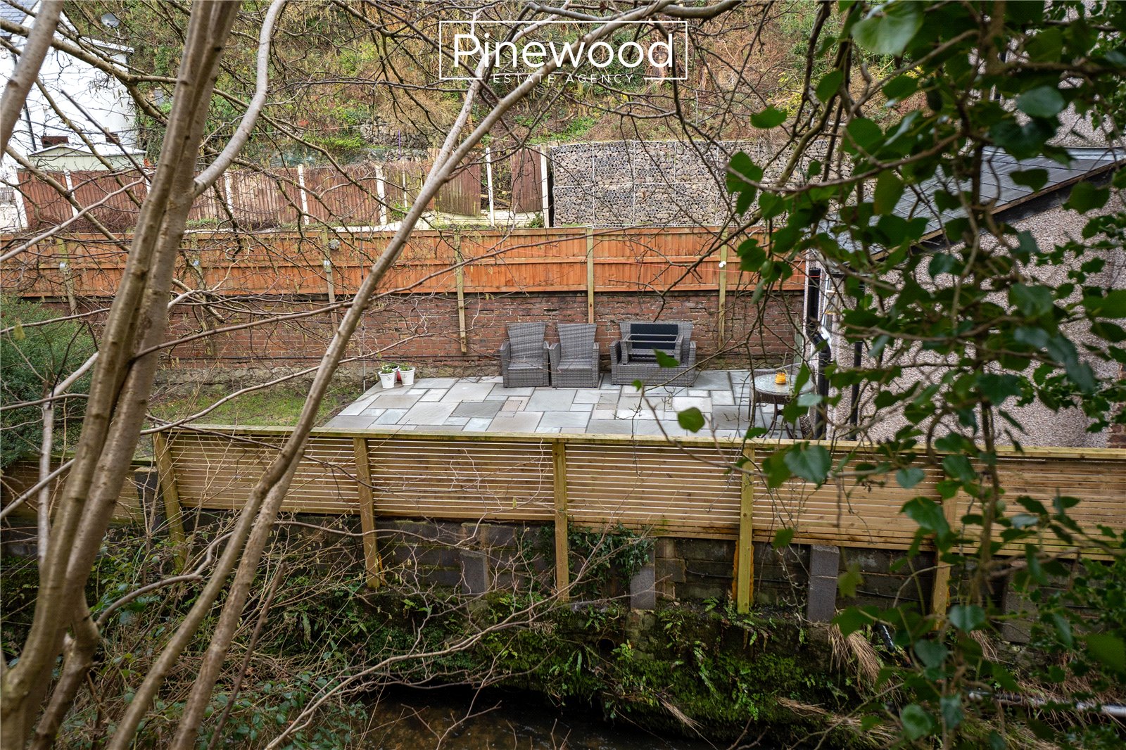 The grounds of this property truly set it apart. A paved patio pathway wraps around to the rear, where you will find a charming outhouse, a generous patio ideal for outdoor dining, and a lawned garden. A wooden bridge invites you across to a decked seating area — the perfect spot for morning coffee, evening drinks, or simply listening to the gentle sound of the nearby Nant as it runs alongside. A wooden staircase then leads you up to a substantial woodland area — just under one acre — offering space to roam, play, walk dogs or simply enjoy the open air.