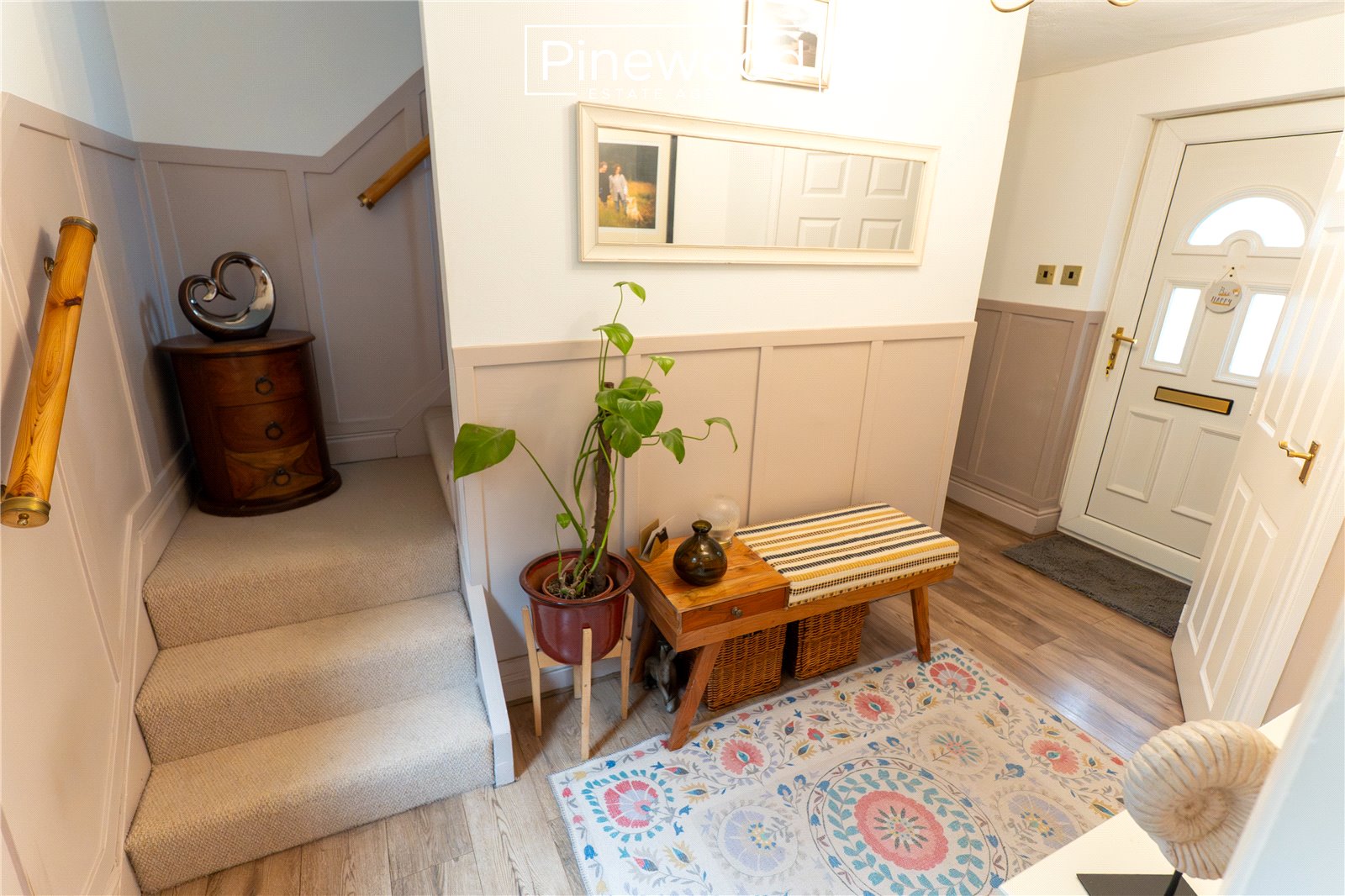 Step inside into a welcoming hallway, complete with a practical storage cupboard for coats and boots — ideal after countryside walks. A convenient downstairs WC comprises a wash basin and WC. The spacious lounge is bathed in natural light from three large windows, with sliding doors opening out onto the patio — perfect for summer evenings. A charming log burner creates a warm and cosy focal point, perfect for those cosy winter nights! The dining room offers a delightful space for family gatherings with ample space for your family dining table. The modern kitchen is both stylish and homely, with elegant grey wall and under counter units complemented by the wooden worktops. Integrated appliances include a gas hob and oven , with plenty of space for further white goods.