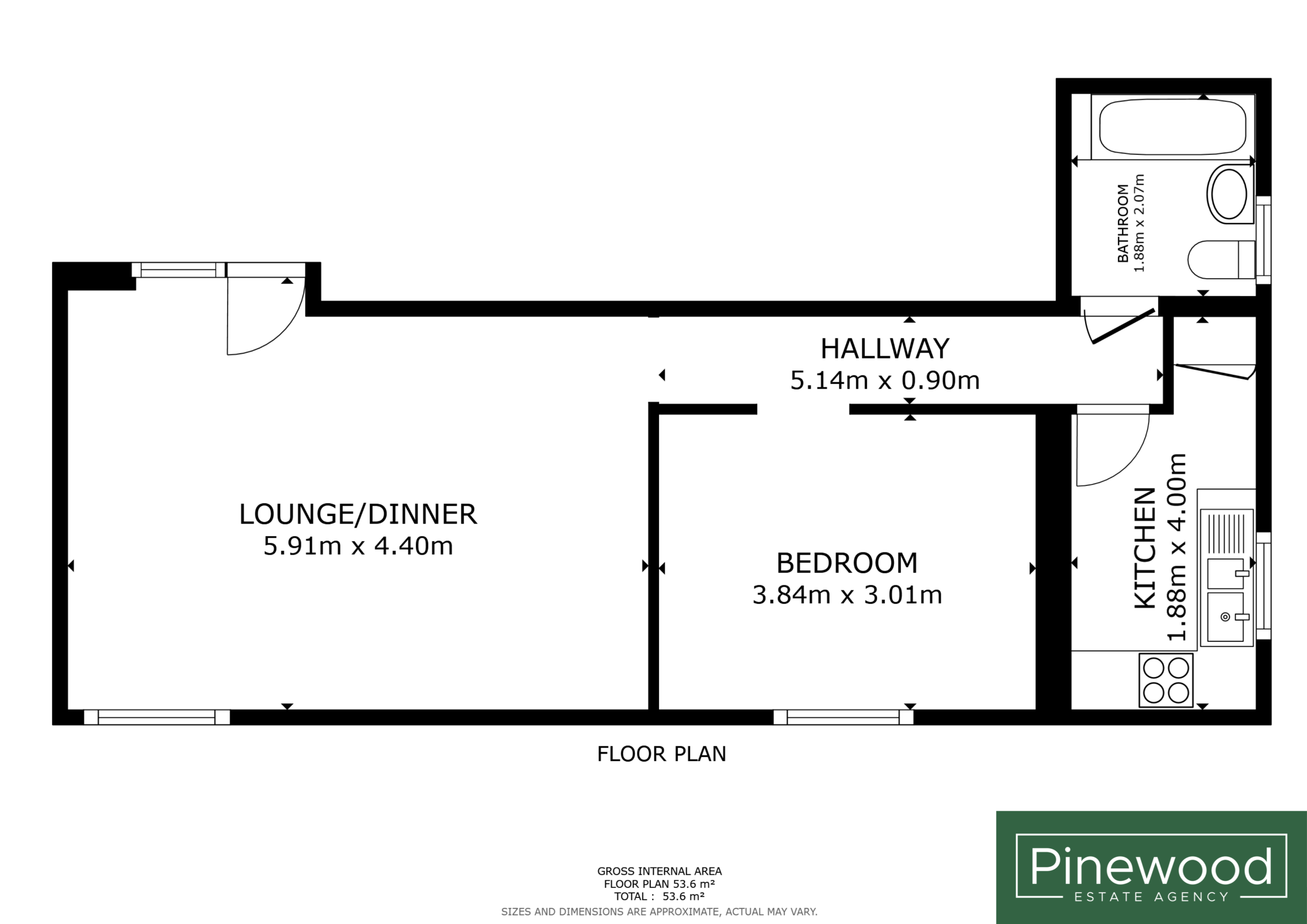 Enter the first-floor apartment in the entrance hallway. In brief this property comprises; lounge, kitchen with integrated oven, hob, a double bedroom and a bathroom consisting of WC, hand basin and bath with mains powered shower above.